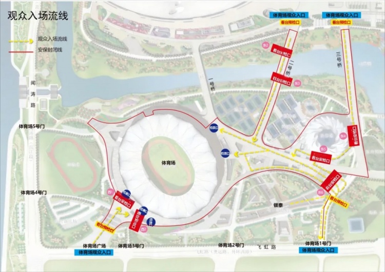 抵達現場(chǎng)的觀(guān)眾,可經(jīng)由 1 號門(mén)、西廣場(chǎng)、2 號橋以及 3 號橋前往體育場(chǎng)入口,有序入場(chǎng)。建議龍之隊、長(cháng)城、中國制躁等有組織的球迷通過(guò)3號橋專(zhuān)用通道到達安檢口。