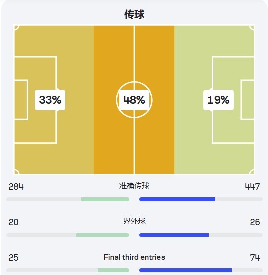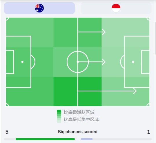 澳大利亞玩的就是效率,控球率、進(jìn)攻三區進(jìn)入次數比印尼還少,可比分卻是大勝(藍色方為印尼)