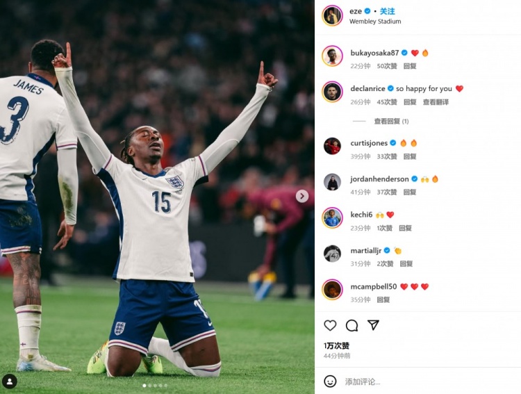 同場(chǎng)打進(jìn)英格蘭隊處子球!里斯-詹姆斯&埃澤社媒曬照紀念
