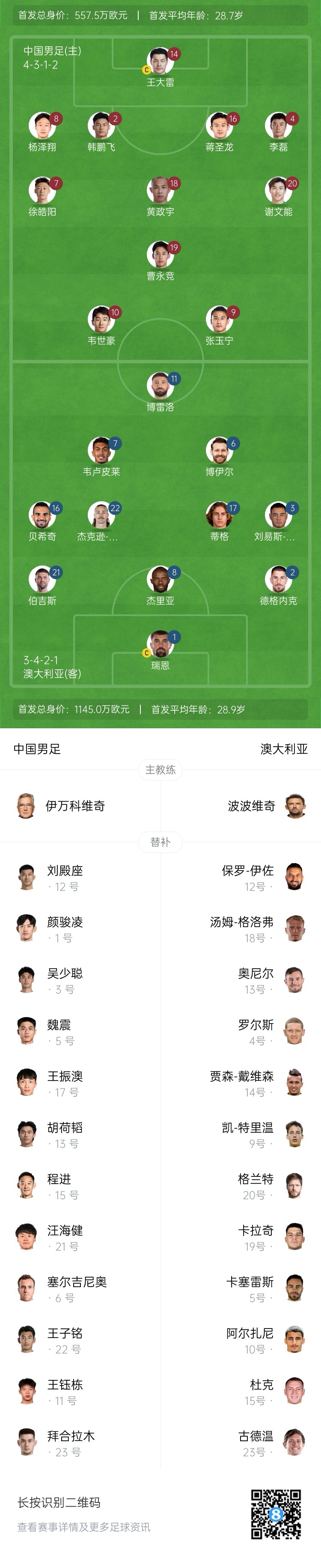 世預賽-中澳之戰首發(fā):韓鵬飛、楊澤翔先發(fā),塞鳥(niǎo)、王鈺棟替補