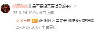 有網(wǎng)友在評論里留言提問(wèn)“你是不是沒(méi)買(mǎi)賈指導的茶葉?”對此王霜回復寫(xiě)道:“謝謝啊,不需要買(mǎi),他送我們姑娘喝?!?/p>