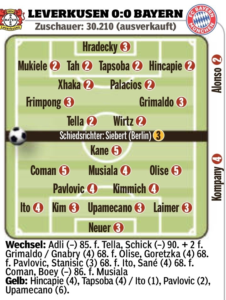 2月16日訊 德甲第22輪比賽,勒沃庫森主場(chǎng)0-0戰平拜仁,德國媒體《圖片報》對兩隊球員進(jìn)行了評分。