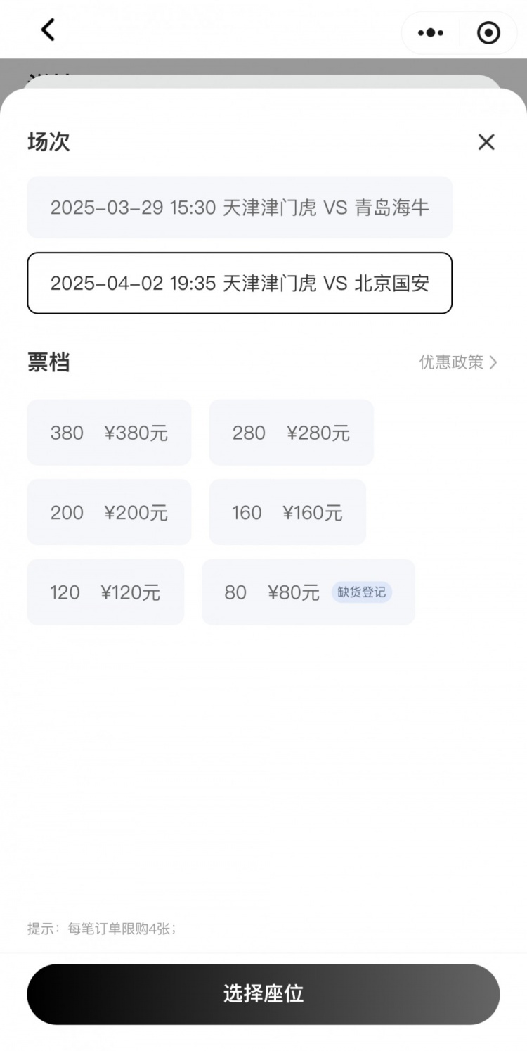 天津津門(mén)虎官方售票平臺信息顯示,本場(chǎng)比賽的門(mén)票開(kāi)票后,僅有80元的最低價(jià)門(mén)票顯示缺貨,其他包括120元、160元、200元、280元、380元在內的多個(gè)檔位仍有大量余票可供購買(mǎi)。