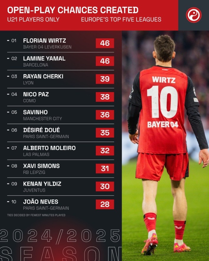 3月27日訊 《Squawka》統計出了本賽季創(chuàng )造重大機會(huì )最多的五大聯(lián)賽U21球員top10,亞馬爾以20次居首,至于運動(dòng)戰創(chuàng )造機會(huì )方面,維爾茨和亞馬爾則以46次并列榜首。