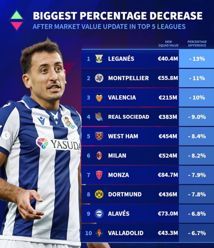 五大聯(lián)賽球隊身價(jià)貶值比例榜:米蘭多特下降約8%,皇社西漢姆在列