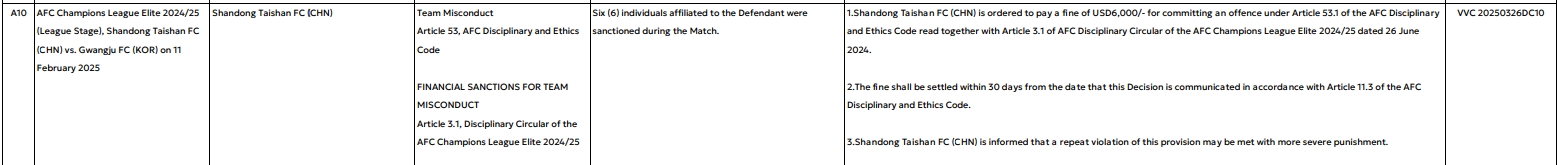 又被罰了!亞足聯(lián)官方:泰山對陣光州時(shí)6人染黃,罰款6000美元