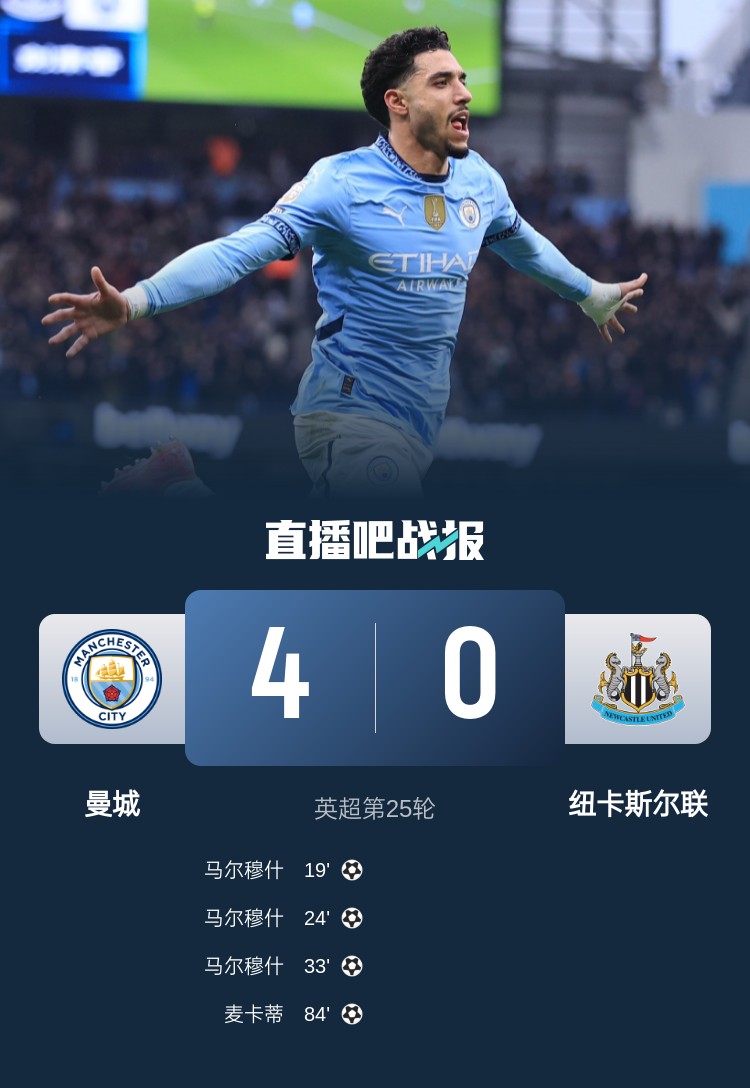 曼城本輪4-0大勝紐卡!馬爾穆什戴帽!麥卡蒂打入一球。