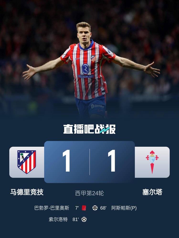 西甲-十人馬競1-1塞爾塔落后榜首1分 索爾洛特建功阿斯帕斯點(diǎn)射