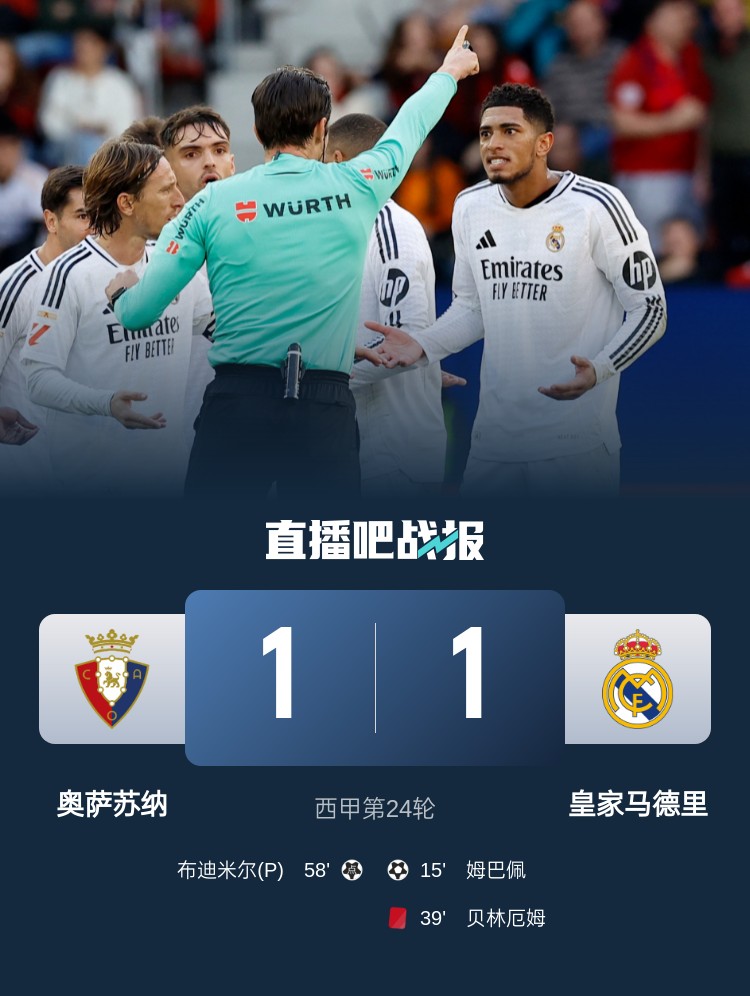 判罰爭議不斷!皇馬本輪1-1戰平奧薩蘇納,姆巴佩破門(mén),貝林厄姆染紅。