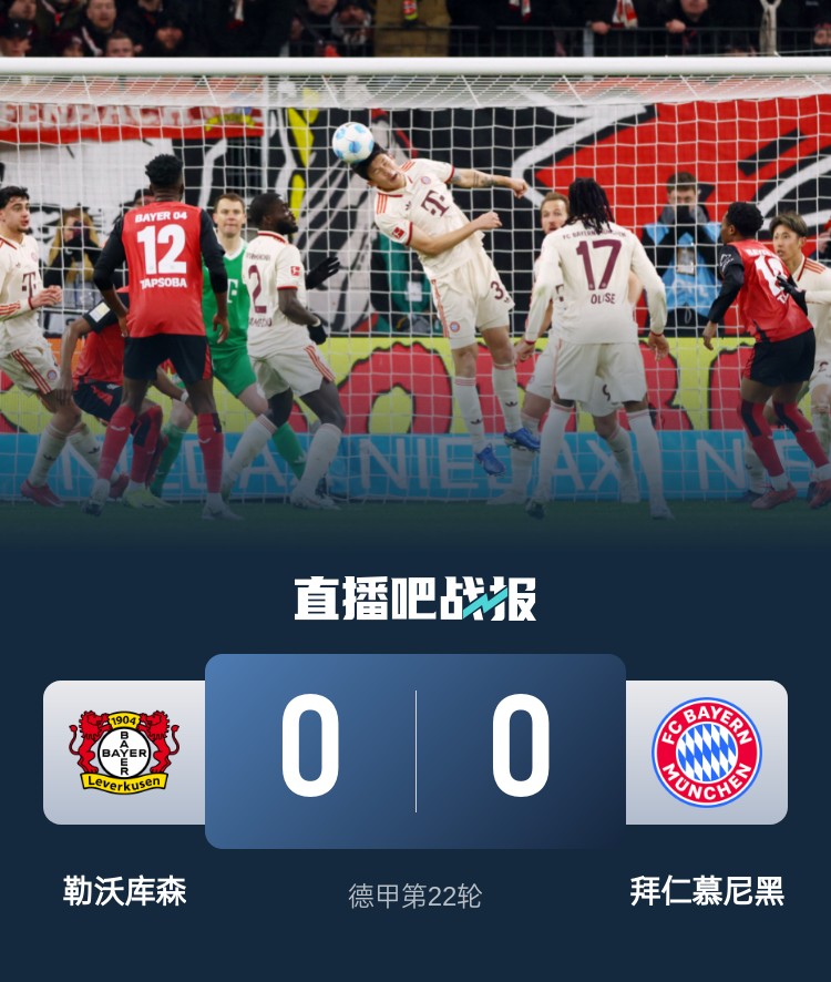 德甲本輪焦點(diǎn)大戰,勒沃庫森0-0戰平拜仁。拜仁7連勝遭終結,8分領(lǐng)跑聯(lián)賽。