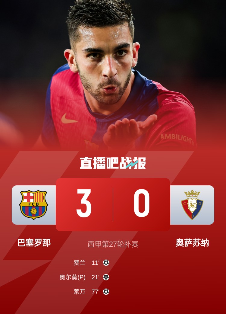 西甲第27輪補賽,巴塞羅那3-0奧薩蘇納,費蘭、萊萬(wàn)進(jìn)球,奧爾莫點(diǎn)球+傷退。