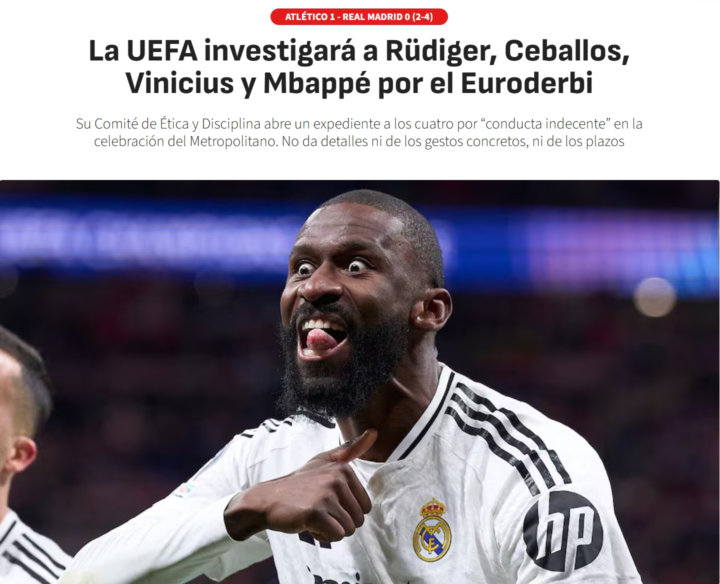03月28日訊 歐足聯(lián)官方昨日發(fā)布官方公告,宣布對姆巴佩、維尼修斯、呂迪格、塞巴略斯4名皇馬球員在歐冠對馬競賽后的不當行為展開(kāi)進(jìn)一步調查?!栋⑺箞蟆吠嘎读嘶蜀R俱樂(lè )部方面對此的立場(chǎng)。