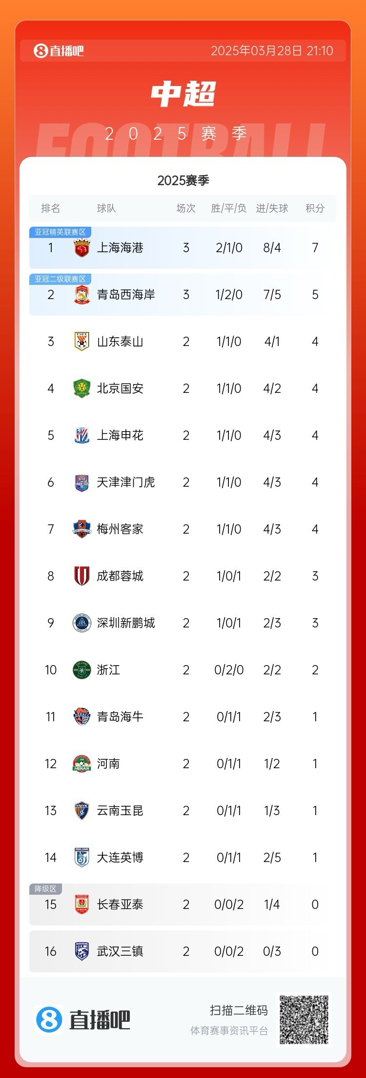 海港3-3絕平西海岸,本賽季中超3輪后已無(wú)全勝球隊