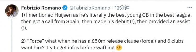 羅馬諾回復道:“第一,我提到懷森是因為他確實(shí)是最佳聯(lián)賽中最為出色的年輕中衛,他得到西班牙隊的征召,然后上演了國家隊的首秀,并送出助攻?!?/p>