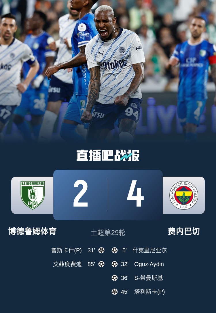 13輪不??!費內巴切4-2博德魯姆體育距榜首6分 塔利斯卡點(diǎn)射+送點(diǎn)