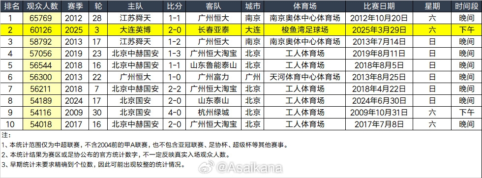 大連英博和長(cháng)春亞泰吸引60126名觀(guān)眾現場(chǎng)觀(guān)戰,中超歷史排名第二
