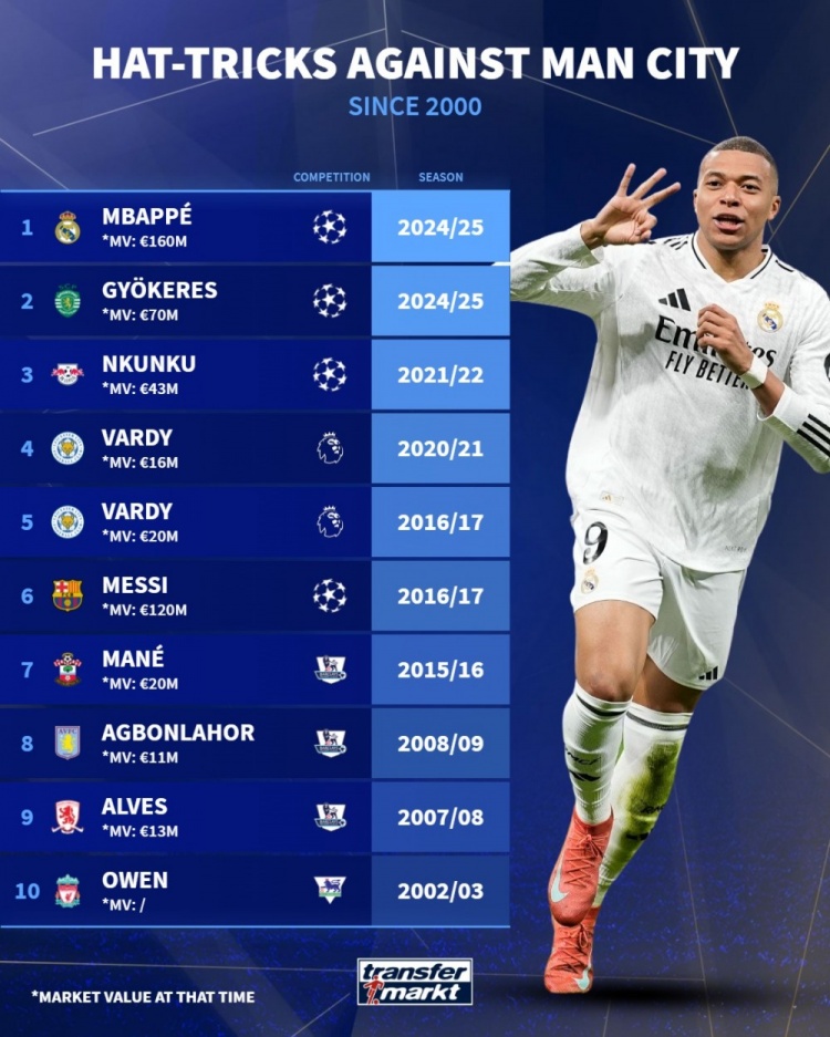 德國轉會(huì )市場(chǎng)盤(pán)點(diǎn)了本世紀以來(lái)對陣曼城戴帽的球員,梅西、姆巴佩、歐文在列,瓦爾迪2次對陣曼城戴帽。
