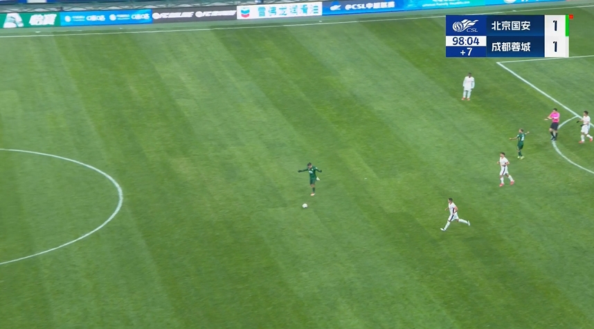 成都最后禁區外射門(mén)和彈子球一樣亂彈了幾下,先是彈到了馬寧腿上,然后又彈向國安進(jìn)攻方面,張玉寧得到球……