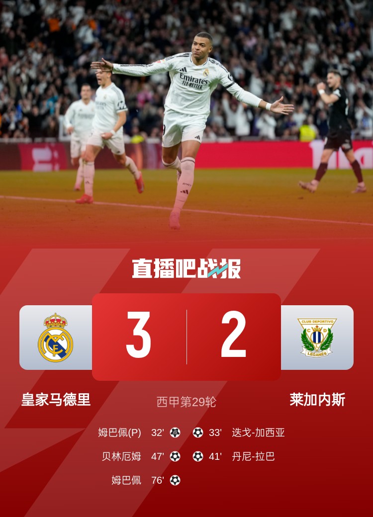 西甲第29輪,皇馬3-2萊加內斯,聯(lián)賽三連勝。上半場(chǎng),居勒爾造點(diǎn),姆巴佩點(diǎn)射,迭戈-加西亞迅速扳平,丹尼-拉巴破門(mén)反超;下半場(chǎng),貝林厄姆建功,姆巴佩再下一城。