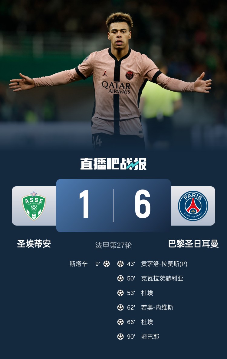 法甲第27輪,巴黎6-1大勝圣埃蒂安,暫以22分優(yōu)勢領(lǐng)跑。上半場(chǎng),斯塔辛首開(kāi)紀錄,貢薩洛-拉莫斯點(diǎn)射扳平;下半場(chǎng),克瓦拉茨赫利亞擴大比分,內維斯破門(mén),杜埃梅開(kāi)二度,姆巴耶打進(jìn)一球。