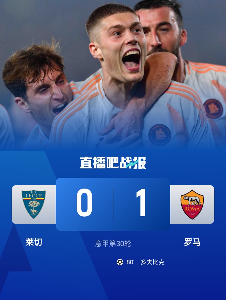 意甲第30輪,萊切0-1羅馬。上半場(chǎng),科內錯失良機;下半場(chǎng),小曼奇尼進(jìn)球被吹,多夫比克低射制勝。
