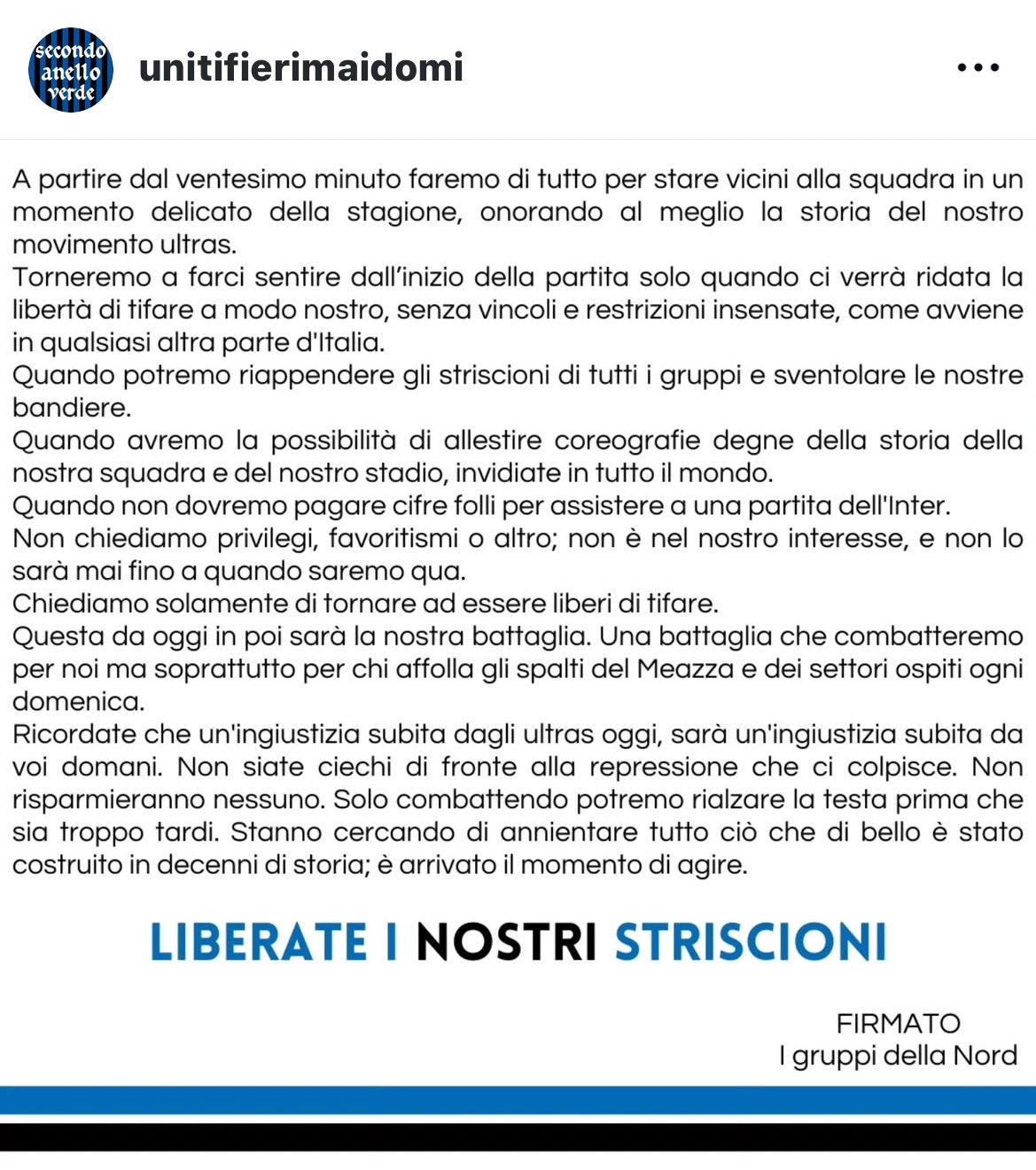 只有當我們重新獲得以自己的方式歡呼的自由時(shí),我們才會(huì )重新讓自己的聲音響起。不受毫無(wú)意義的約束和限制,就像在意大利的任何其他球場(chǎng)發(fā)生的那樣。