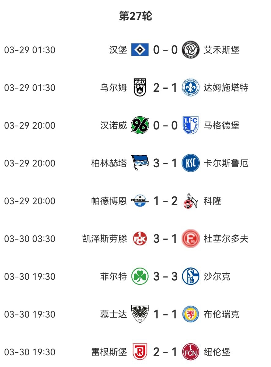 激烈!德乙積分:漢堡第2落后第1科隆1分,3-9名差5分&k神帶隊第8