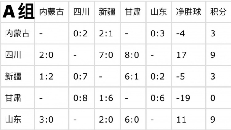 目前,四川和山東同積9分,憑借出色的表現已提前鎖定出線(xiàn)資格。在凈勝球方面,四川以17個(gè)凈勝球領(lǐng)先,山東凈勝球為11個(gè)。內蒙古和新疆均積3分,甘肅積0分已確定無(wú)緣出線(xiàn)。最后一輪比賽,雖無(wú)直接影響出線(xiàn)的關(guān)鍵對決,但各隊仍會(huì )為榮譽(yù)而戰,力求以更好的成績(jì)結束資格賽階段。