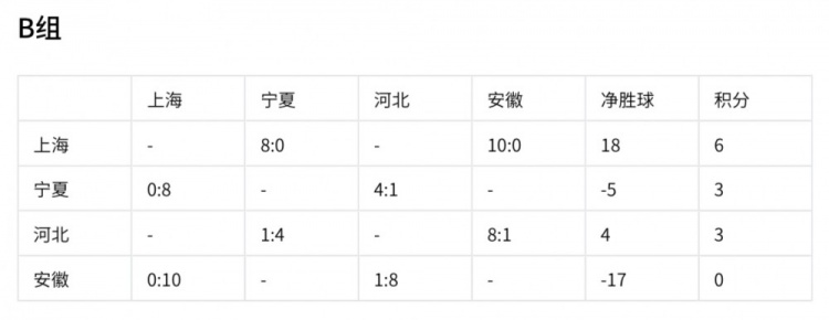上海隊以6分、18個(gè)凈勝球的優(yōu)勢提前出線(xiàn)。寧夏和河北同積3分,寧夏凈勝球為 -5,河北凈勝球為4,安徽積0分已出局。最后一輪比賽,各隊的表現將決定最終排名,寧夏和河北都渴望在最后一戰中爭取更好名次。