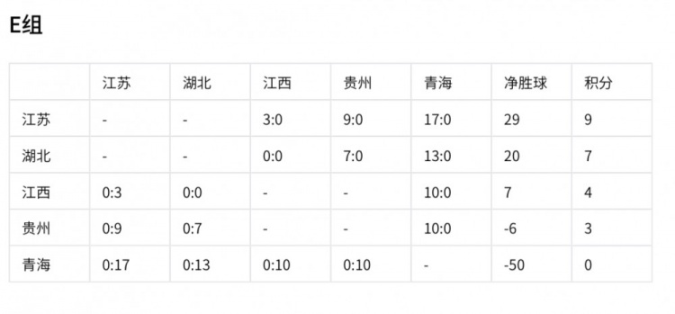 江蘇隊以9分和29個(gè)凈勝球的絕對優(yōu)勢提前出線(xiàn)。湖北積7分、凈勝球20個(gè),出線(xiàn)形勢大好;江西積4分、凈勝球7個(gè),仍有出線(xiàn)機會(huì );貴州積3分、凈勝球 -6,青海積0分、凈勝球 -50已出局。最后一輪比賽,各隊之間的競爭將決定剩余出線(xiàn)名額的歸屬,比賽結果充滿(mǎn)懸念。