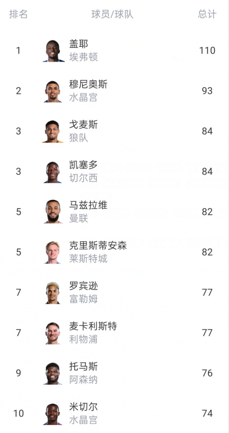 110次!埃弗頓中場(chǎng)蓋耶是本賽季英超唯一搶斷次數超100的球員