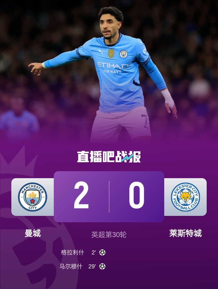 格拉利什閃擊破門(mén),馬爾穆什擴大領(lǐng)先優(yōu)勢,曼城2-0擊敗萊斯特城。