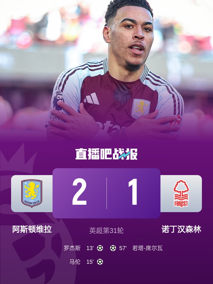 英超第31輪,維拉2-1森林,終結對手英超3連勝。上半場(chǎng),羅杰斯和馬倫2分鐘內幫助維拉2球領(lǐng)先;下半場(chǎng),若塔-席爾瓦扳回一球。