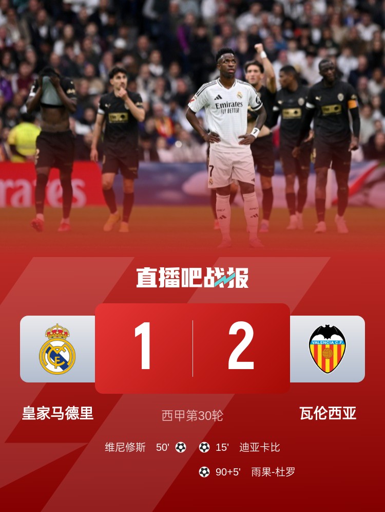 遭絕殺!皇馬1-2瓦倫 維尼修斯進(jìn)球+失點(diǎn)杜羅絕殺 皇馬落后3分