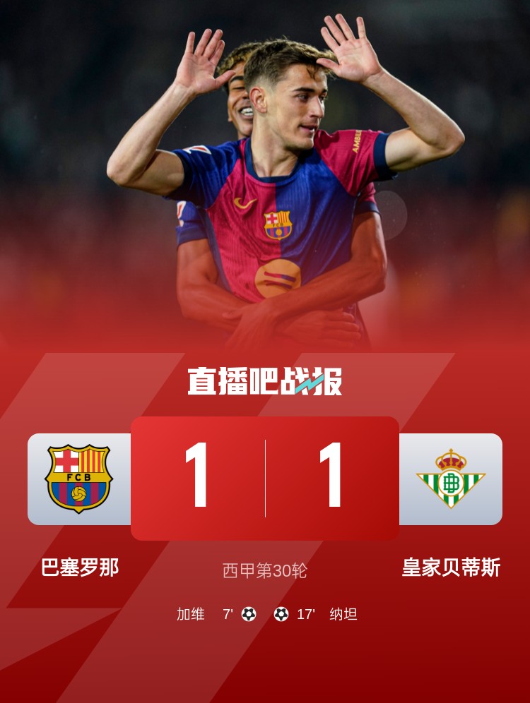 西甲第30輪,巴薩1-1貝蒂斯,聯(lián)賽九連勝終結。上半場(chǎng),費蘭-托雷斯助攻加維破門(mén),納坦扳平;下半場(chǎng),兩隊均未改寫(xiě)比分。
