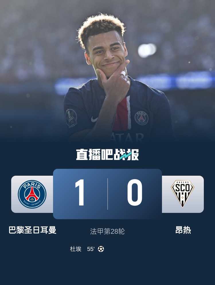 法甲第28輪,巴黎圣日耳曼主場(chǎng)1-0擊敗昂熱,提前6輪鎖定冠軍。上半場(chǎng),帕喬破壞單刀,維蒂尼亞遠射造險;下半場(chǎng),克瓦拉茨赫利亞助攻杜埃搶點(diǎn)破門(mén)。