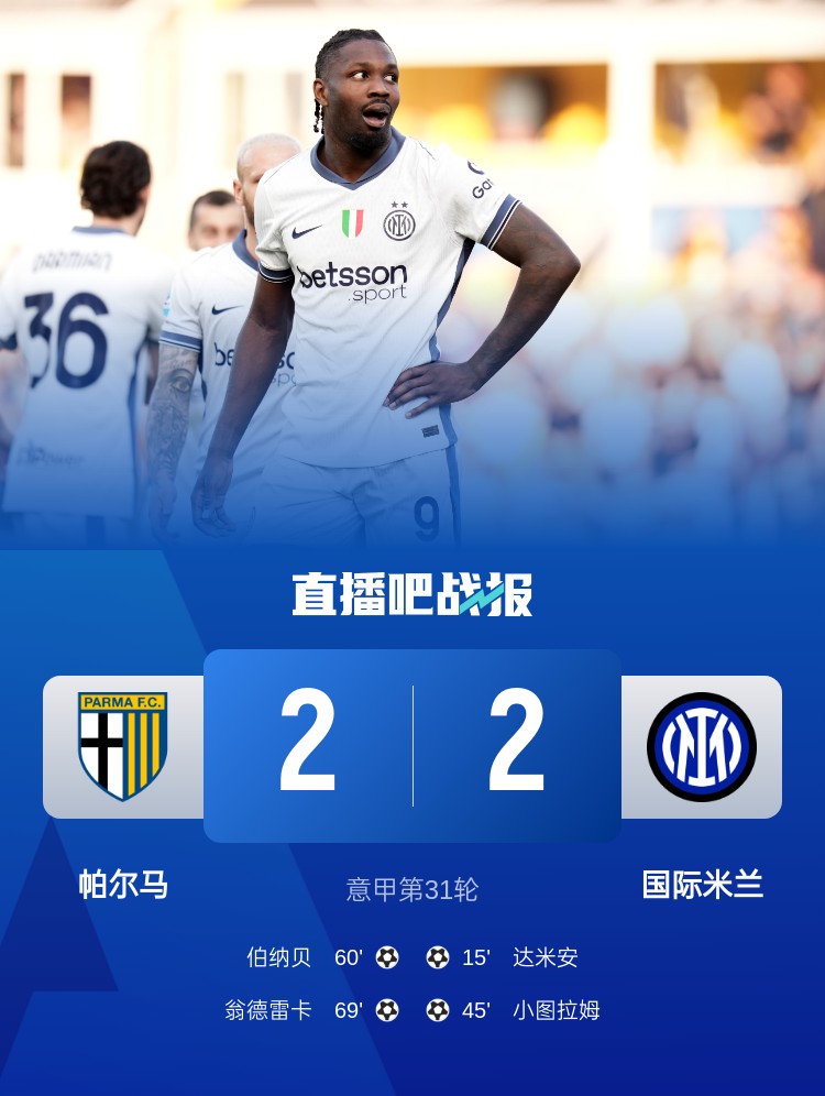 意甲第31輪,國米客場(chǎng)2-2帕爾馬。上半場(chǎng),達米安勁射破門(mén),小圖拉姆搶點(diǎn)建功;下半場(chǎng),伯納貝遠射扳回一城,翁德雷卡抽射變線(xiàn)入網(wǎng)扳平。