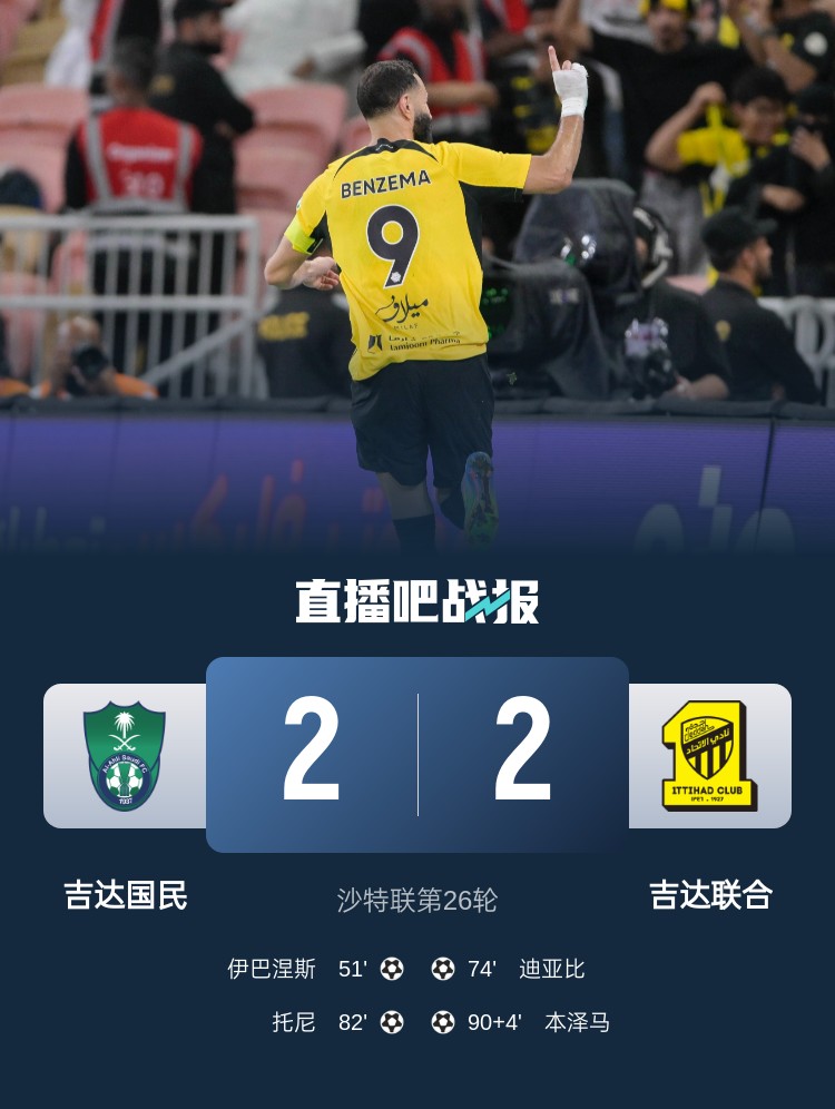 沙特聯(lián)第26輪,吉達聯(lián)合2-2吉達國民仍5分領(lǐng)跑。上半場(chǎng),馬赫雷斯遠射造險,托尼禁區被薩德放倒裁判沒(méi)表示,吉達聯(lián)合0射正;下半場(chǎng),坎特失空門(mén),伊巴涅斯頭球破僵,迪亞比推射破門(mén)扳平,坎特烏龍助攻托尼抽射反超,本澤馬補時(shí)絕平。