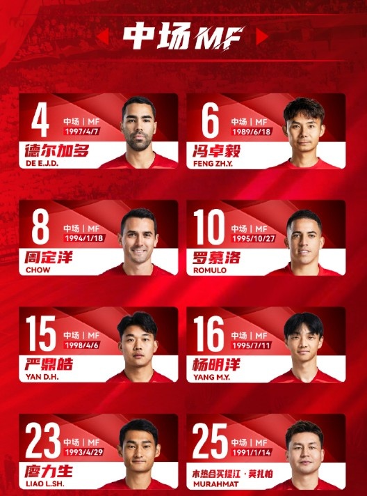 中場(chǎng):4-德?tīng)柤佣唷?-馮卓毅、8-周定洋、10-羅慕洛、15-嚴鼎皓、16-楊明洋、23-廖力生、25-木熱合買(mǎi)提江-莫扎怕、20-木塔力甫-依明卡日、39-甘超、58-廖榮祥