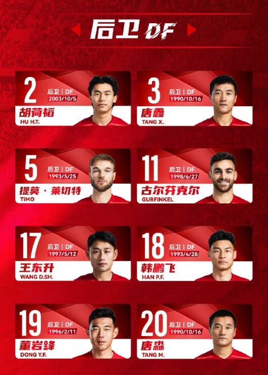 前鋒:7-韋世豪、9-費利佩、24-唐創(chuàng )、41-艾比布拉-努爾阿吉、45-艾孜買(mǎi)提-凱薩爾、47-伊薩-卡隆、48-李漠雨
