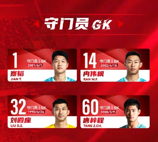 門(mén)將:1-蹇韜、14-冉偉楓、32-劉殿座、60-唐梓程