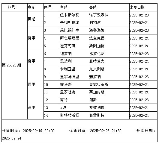 傳足勝負彩第25028期競猜賽事涵蓋五大聯(lián)賽,其中英超曼城VS利物浦是全歐關(guān)注的焦點(diǎn),此外拜仁、尤文和皇馬等豪門(mén)也將陸續出戰。