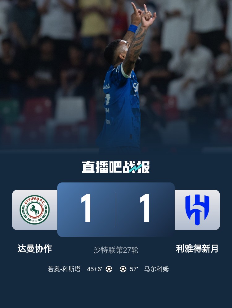 沙特聯(lián)第27輪,利雅得新月1-1達曼協(xié)作。上半場(chǎng),若奧-科斯塔再補時(shí)最后時(shí)刻世界波破門(mén);下半場(chǎng),洛迪助攻馬爾科姆破門(mén)扳平比分。
