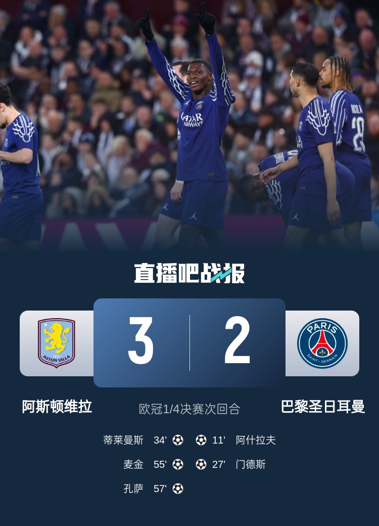 歐冠1/4決賽次回合,巴黎客場(chǎng)2-3維拉,總比分5-4驚險晉級4強。上半場(chǎng),阿什拉夫破門(mén),努諾-門(mén)德斯再下一城,蒂萊曼斯扳回一球;下半場(chǎng),麥金遠射,拉什福德邊路強行爆破,助攻孔薩破門(mén),阿森西奧錯失扳平良機,多納魯馬多次關(guān)鍵神撲。