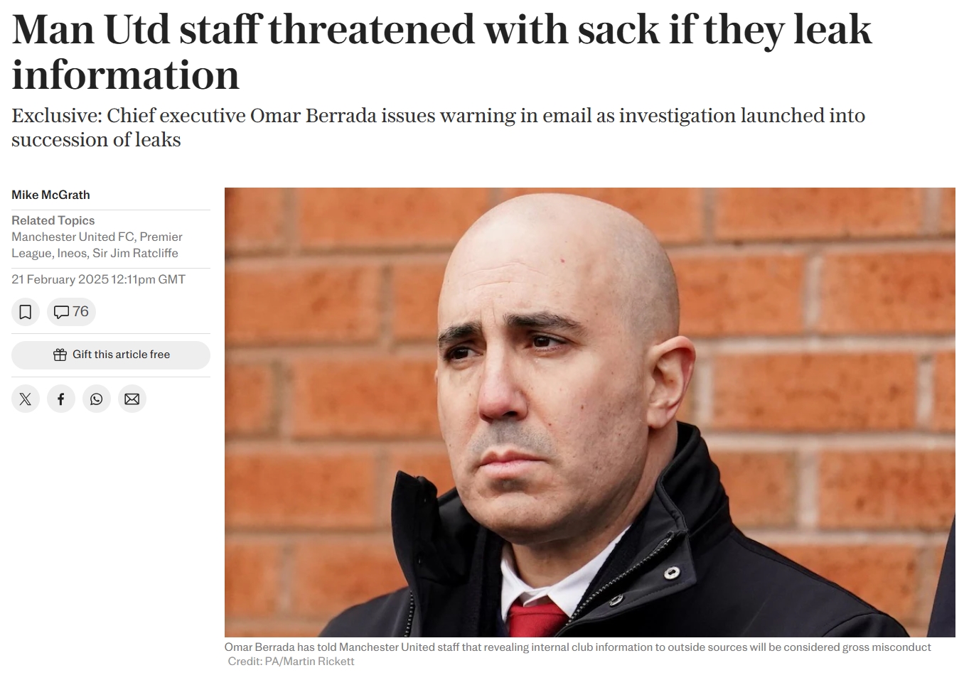 曼聯(lián)此前深受隊內首發(fā)信息被提前泄露的困擾。在本周早些時(shí)候,貝拉達向曼聯(lián)員工發(fā)送了一封580字的郵件,工作人員被告知俱樂(lè )部目前正在采取額外措施防止這一現象發(fā)生。