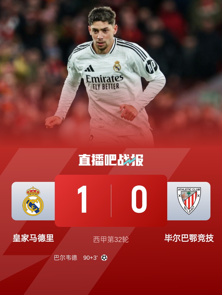落后榜首4分!皇馬1-0畢爾巴鄂 巴爾韋德補時(shí)世界波絕殺制勝