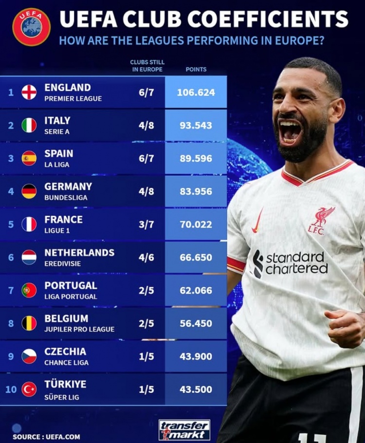 歐足聯(lián)各大聯(lián)賽5年歐戰積分:(本賽季參賽球隊以及當前仍未淘汰球隊)