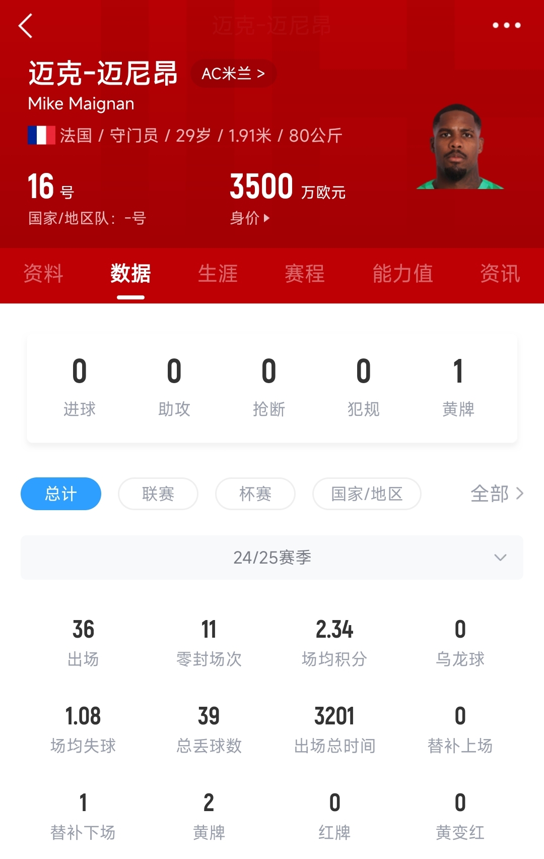 本賽季邁尼昂代表米蘭出戰36場(chǎng)比賽丟39球,完成11次零封。邁尼昂與米蘭的現有合同將在2026年6月到期,他在米蘭的稅后年薪為280萬(wàn)歐元。續約后500萬(wàn)歐的年薪,將使邁尼昂與萊奧持平,成為米蘭隊內薪水最高的球員。