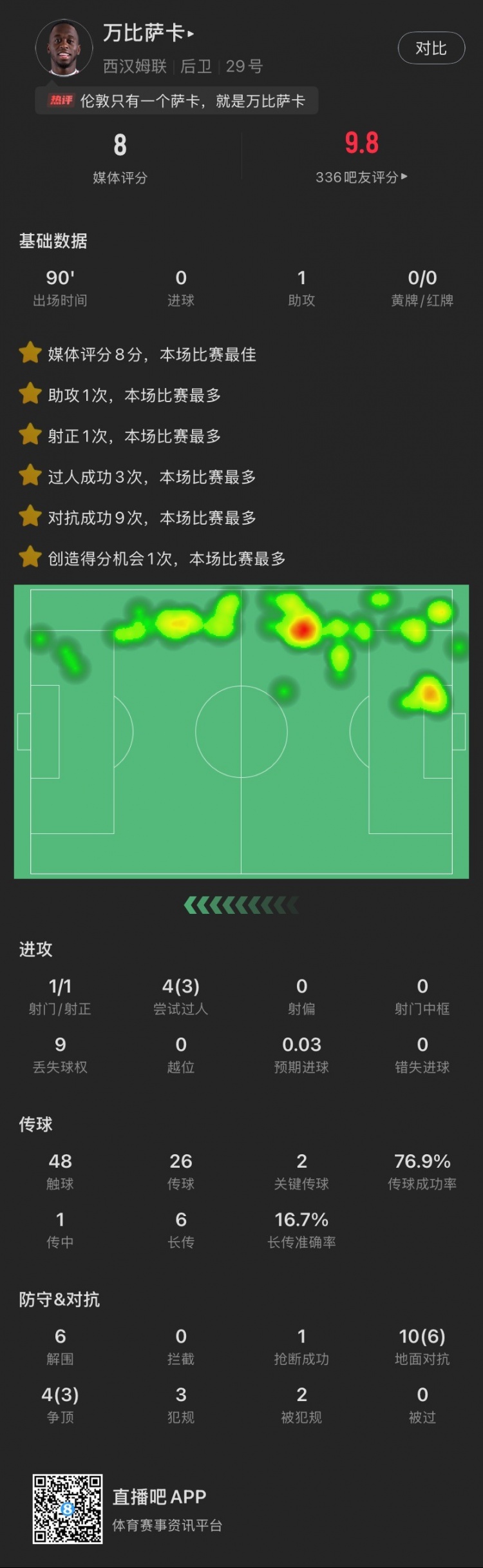 2月23日訊 在剛剛結束的英超比賽中,西漢姆1-0擊敗阿森納。本場(chǎng)比賽,曼聯(lián)舊將萬(wàn)-比薩卡發(fā)揮出色,送出1助攻,獲評8分全場(chǎng)最高。