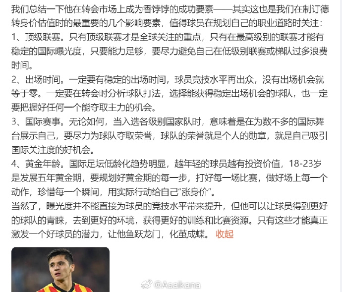 我之前寫(xiě)了篇介紹胡桑諾夫的長(cháng)微博,提出了一個(gè)球員曝光度對于球員職業(yè)生涯和能力影響的問(wèn)題。其實(shí)當時(shí)有很大程度上是寫(xiě)給準備迎接各級大賽的各年齡段國足,尤其是當時(shí)正在備戰亞青賽的國青隊員和家長(cháng)們看的。很巧,我看到賽后有很多人也都在為國青球員們失去了在世界球探面前展現自己的機會(huì )而惋惜不已。一個(gè)有才華的球員,只有在足夠的曝光度下,才能從被忽視的角落走向舞臺的中央,迎接屬于自己的機遇與挑戰。只有當他站在更廣闊的平臺上,才能借助更強大的資源,迅速提升自我,釋放潛力,達到職業(yè)巔峰。但是真的很可惜,可惜到我已經(jīng)不想去回想下午那場(chǎng)球了。
